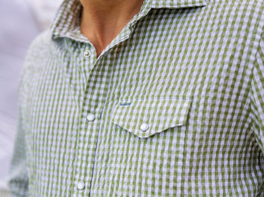 Performance Pearl Snap Button Down Gingham Seersucker - Olive