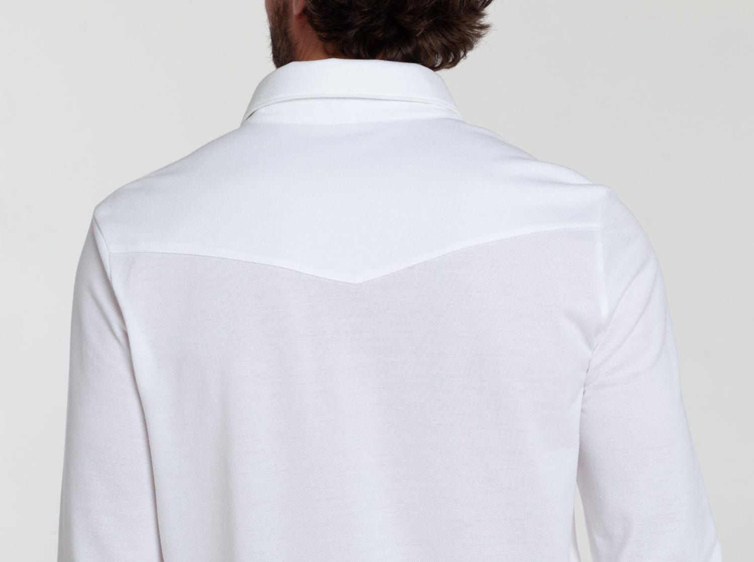 This is not your typical stiff Oxford button down. It's a knit shirt, not a woven one, so it's soft, stretchy, and real easy to wear straight out of the bag. It's got the look of a dress shirt and the feel of a polo, and is anything but stiff.